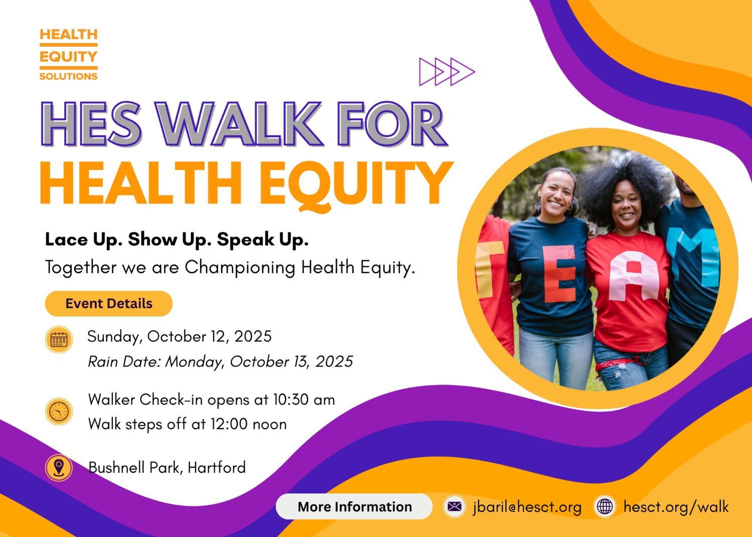| Friend, welcome to Health Equity Solutions' monthly newsletter! | | On Sunday, October 12, 2025, Health Equity Solutions will host its first-ever Walk for Health Equity in downtown Hartford—and we want you to be a part of it. It’s more than a walk. It’s a powerful show of solidarity, awareness, and action. Why it Matters: Because every Connecticut resident deserves the chance to live a long, healthy life—regardless of their zip code, income, or background. Health disparities aren’t just statistics: they’re real people experiencing unequal access, unequal care, and unequal outcomes. Your participation helps amplify voices, fund vital programs, and push forward anti-racist policies so that health equity is not just an aspiration, but a reality. Our Goal: We aim to raise $50,000 to support Health Equity Solutions’ work in community conversations, health equity advocacy, and policy change. Every dollar helps to strengthen initiatives like outreach, training anti-racist leadership, and ensuring that everyone in CT has fair access to health. What to Expect: Fun for the whole family with pre-walk wellness & yoga, food and entertainment, and a chance to connect with neighbors, health activists, and local leaders. How You Can Help: -