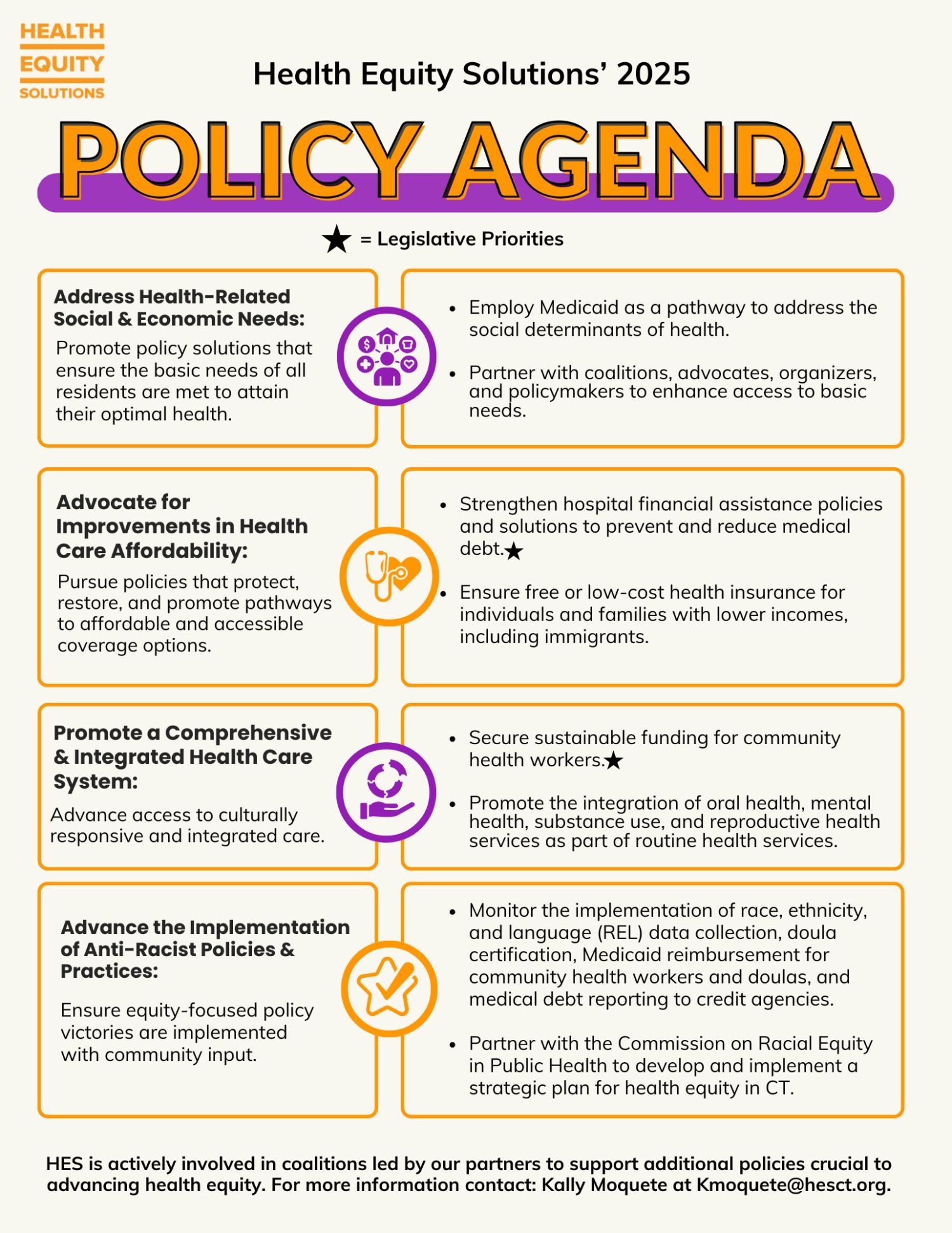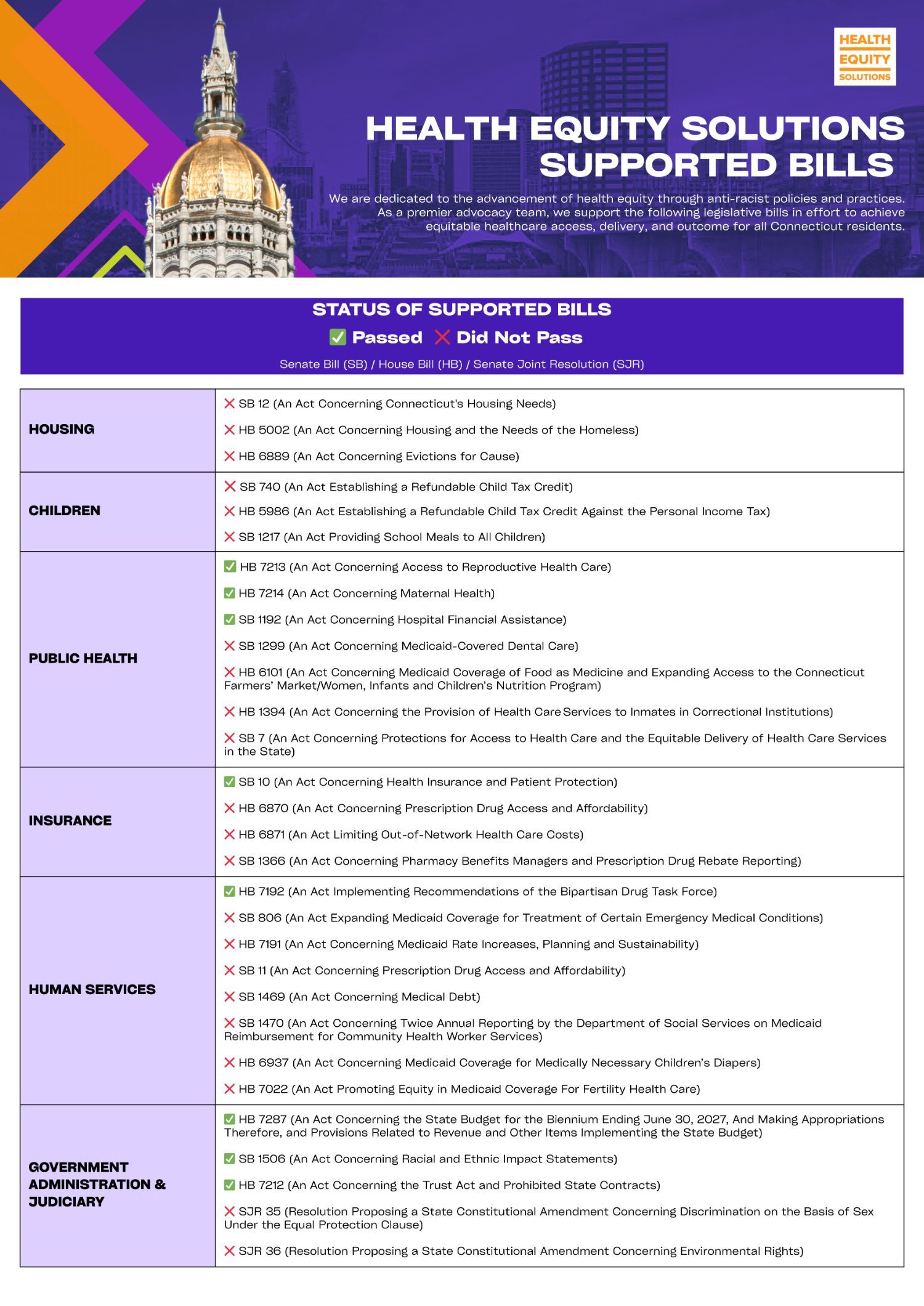 SB 10: AN ACT CONCERNING HEALTH INSURANCE AND PATIENT PROTECTION includes many provisions to advance health equity, including: (1) establishing reporting requirements and enforcement of compliance with mental health and substance use disorder benefit laws, (2) creating a mental health parity advancement account; (3) requiring health insurance to prove certain health care services under adverse determination or utilization review are not medically necessary; and more. This bill, now PA 25-94, is awaiting the Governor’s signature.